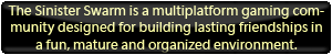 Welcome to the Sinister Swarm Gaming Community! While our main focus is maintaining an enjoyable family like environment for mature gamers, our gameplay has also set records across all the titles we've played: Dark Age of Camelot (2002) Largest guild on Bors server... Guild Wars (2005) top 1% in Guild vs Guild battles, ArenaNet's Guild of the week ... Warhammer (2008) #1 Renoun on Iron Rock sever ... Ten Ton Hammer's Guild of the Week ... Aion (2009) #2 Ranked guild on Ariel sever ... Star Trek Online (2009) MMO Reporter joined and mentioned our community ... Global Agenda (2009) #1 Ranked in AvA battle ... We put the WAR in SWARM!